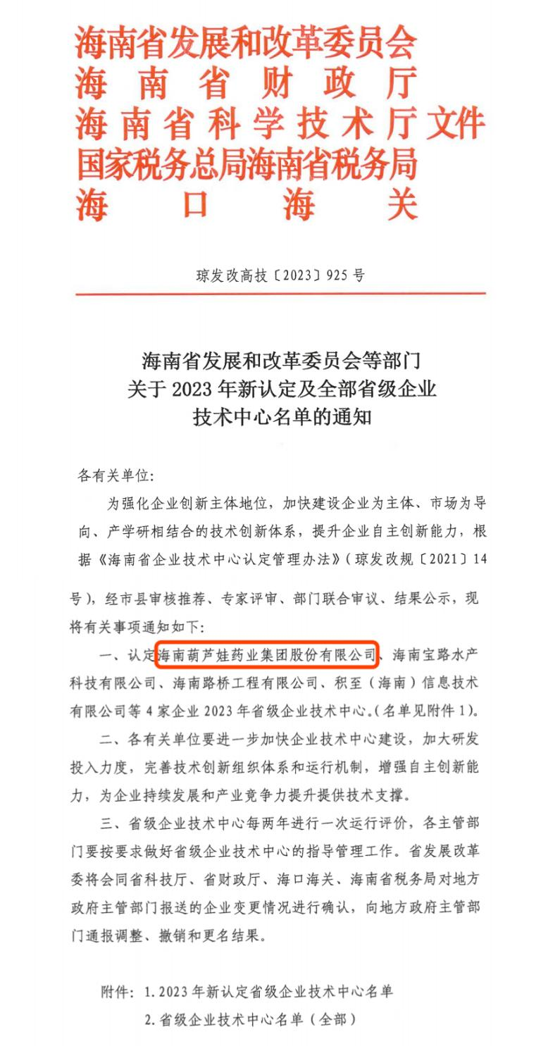 近日,海南省发改委等多部门联合公布了《关于2023年新认定及全部省级企业技术中心名单的通知》,其中,海南BC贷药业集团股份有限公司成功通过评审,被认定为省级企业技术中心,是本次获批的4家企业之一。